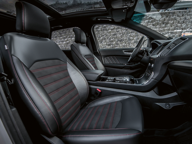 In the ST Line cabin, Active X is complemented by Miko inserts. Both front seats are power-adjustable and power-heated. Red stitching dresses up the steering wheel. Even the floor has sport aspects such as the unique metallic pedals, door-sill scuff plates and accented floor mats.