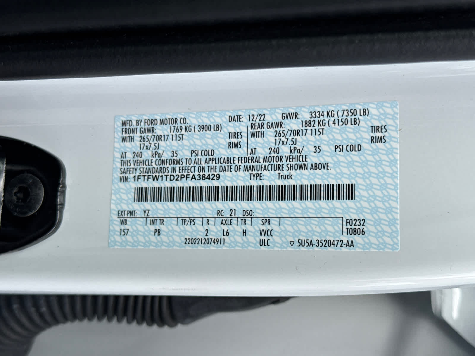 VIN: 1FTFW1TD2PFA38429