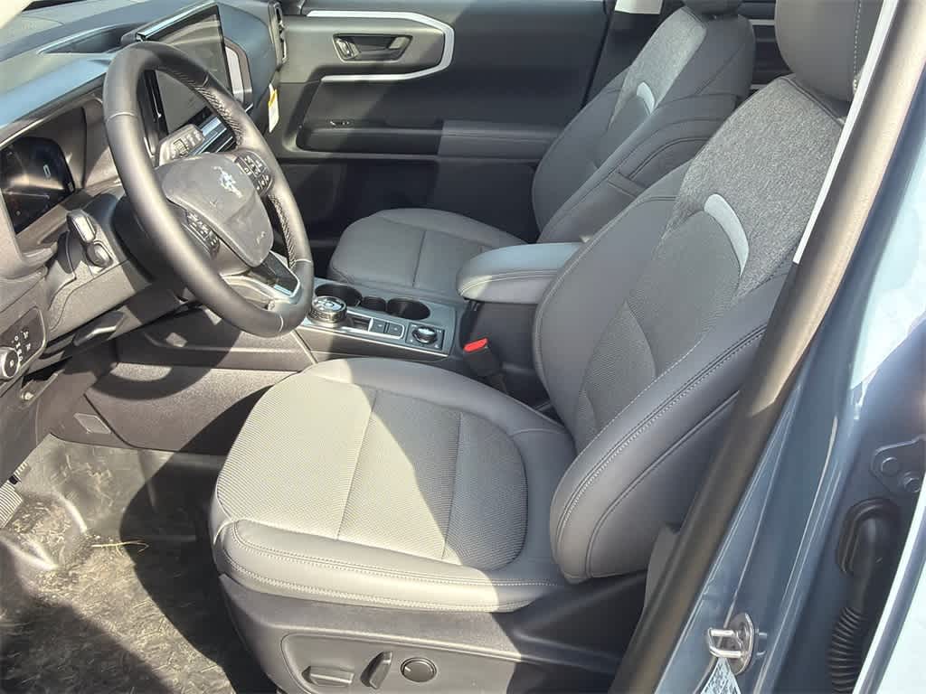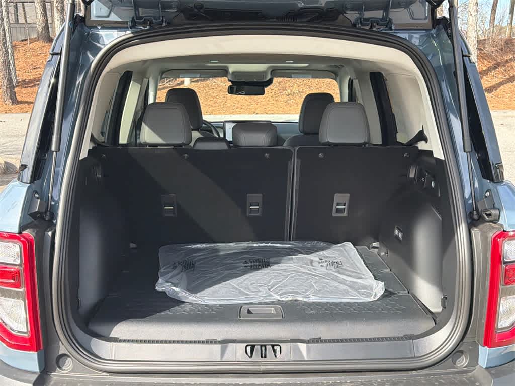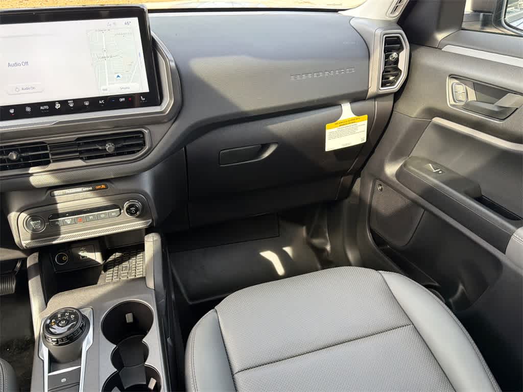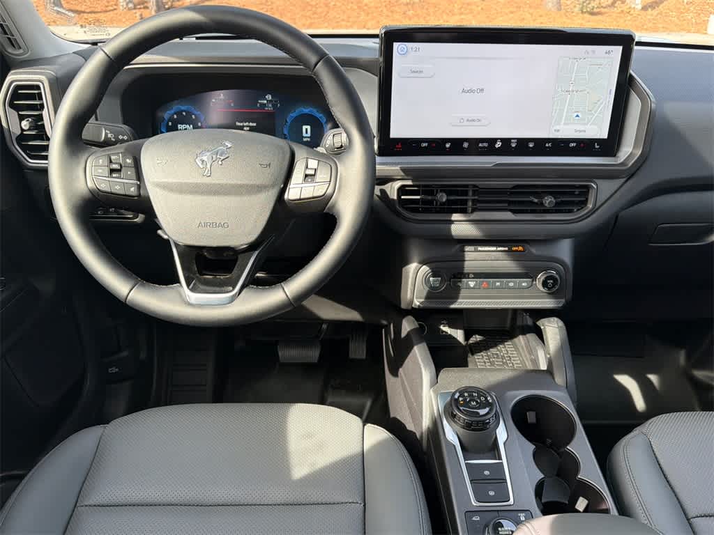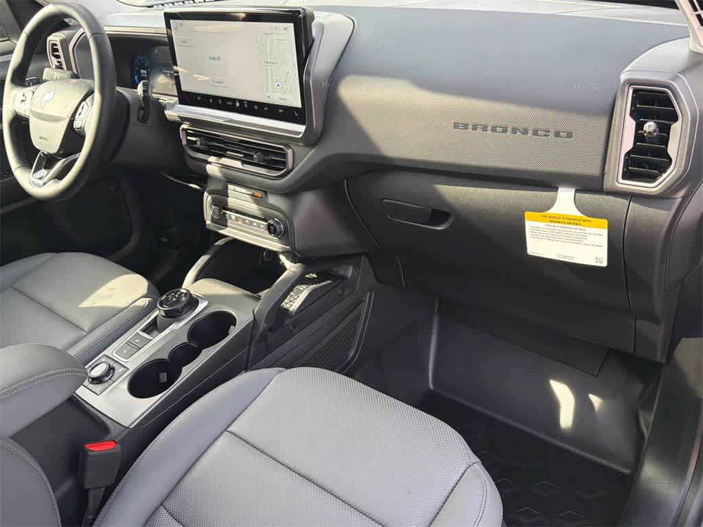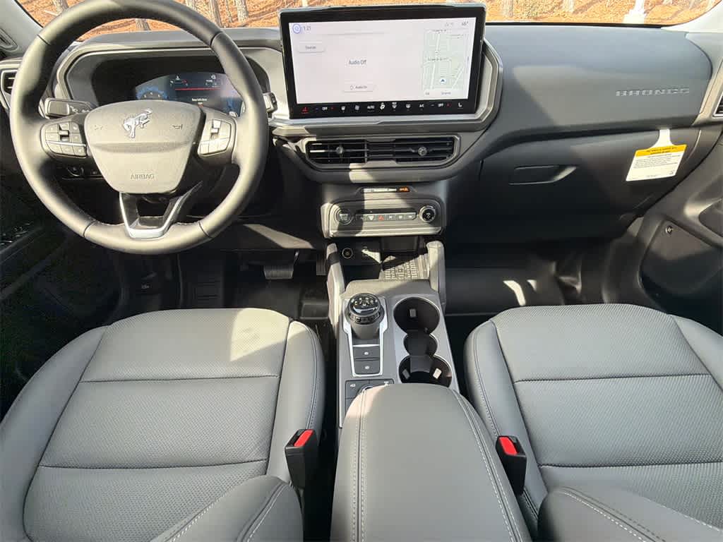 Bronco Sport Badlands is nicely equipped with Badlands Tech Package (B&O Sound System by Bang & Olufsen, Connected Navigation, and HD Radio), Equipment Group 400A, 4-Wheel Disc Brakes, 6 Speakers, ABS brakes, Air Conditioning, Alloy wheels, AM/FM radio: SiriusXM, AM/FM Stereo, Auto High-beam Headlights, Auto-dimming Rear-View mirror, Automatic temperature control, Brake assist, Compass, Delay-off headlights, Driver door bin, Driver vanity mirror, Dual front impact airbags, Dual front side impact airbags, Electronic Stability Control, Emergency communication system: SYNC 4 911 Assist, Four wheel independent suspension, Front anti-roll bar, Front Bucket Seats, Front Center Armrest, Front fog lights, Front reading lights, Fully automatic headlights, Garage door transmitter, Heated door mirrors, Heated front seats, Heated steering wheel, Illuminated entry, Knee airbag, Leather Trimmed Front Bucket Seats, Low tire pressure warning, Memory seat, Occupant sensing airbag, Outside temperature display, Overhead airbag, Overhead console, Panic alarm, Passenger door bin, Passenger vanity mirror, Power door mirrors, Power driver seat, Power Moonroof, Power passenger seat, Power steering, Power windows, Radio data system, Rear anti-roll bar, Rear reading lights, Rear seat center armrest, Rear window defroster, Rear window wiper, Remote keyless entry, Security system, SiriusXM, Speed control, Speed-sensing steering, Speed-Sensitive Wipers, Split folding rear seat, Steering wheel mounted audio controls, SYNC 4 w/Enhanced Voice Recognition, Tachometer, Telescoping steering wheel, Tilt steering wheel, Traction control, Trip computer, Variably intermittent wipers, and Wheels: 17 Matte Black-Painted Aluminum.