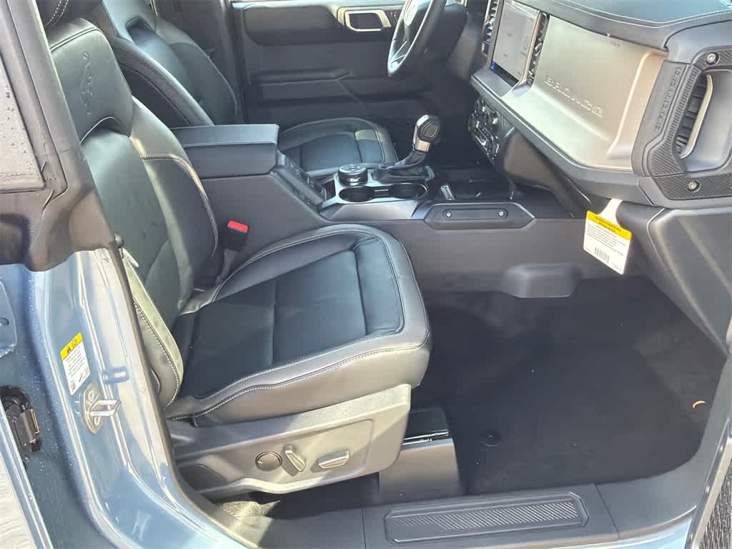 Bronco Outer Banks Advanced is nicely equipped with Equipment Group 314A Lux Package (360-Degree Camera, Adaptive Cruise Control, Evasive Steering Assist, Front Parking Sensors, Information on Demand Panel, Radio: B&O Sound System by Bang & Olufsen, Sideview Mirrors, and Universal Garage Door Opener), 18 Bright Machined Aluminum Wheels, 3.73 Axle Ratio, 4-Wheel Disc Brakes, 7 Speakers, ABS brakes, Air Conditioning, Alloy wheels, AM/FM radio: SiriusXM with 360L, AM/FM Stereo, Auto High-beam Headlights, Auto-dimming Rear-View mirror, Automatic temperature control, Brake assist, Compass, Connected Navigation, Delay-off headlights, Driver door bin, Driver vanity mirror, Dual front impact airbags, Dual front side impact airbags, Electronic Stability Control, Emergency communication system: 911 Assist, Exterior Parking Camera Rear, Front anti-roll bar, Front Bucket Seats, Front Center Armrest, Front dual zone A/C, Front fog lights, Front reading lights, Front wheel independent suspension, Fully automatic headlights, Hard Top Sound Deadening Headliner, Heated door mirrors, Heated front seats, Heated Leather-Trimmed/Vinyl Bucket Seats, Heated steering wheel, Illuminated entry, Integrated roll-over protection, Internet access capable: FordPass Connect, Leather Shift Knob, Low tire pressure warning, Navigation system: Connected Navigation, Occupant sensing airbag, Outside temperature display, Overhead airbag, Overhead console, Painted Hard Top, Panic alarm, Passenger door bin, Passenger vanity mirror, Power door mirrors, Power driver seat, Power passenger seat, Power steering, Power windows, Radio data system, Rear seat center armrest, Rear-Window Defroster & Washer, Remote keyless entry, Security system, SiriusXM w/360L, Speed control, Split folding rear seat, Steering wheel mounted audio controls, SYNC 4, Tachometer, Telescoping steering wheel, Tilt steering wheel, Traction control, Trip computer, Variably intermittent wipers, and Voltmeter.