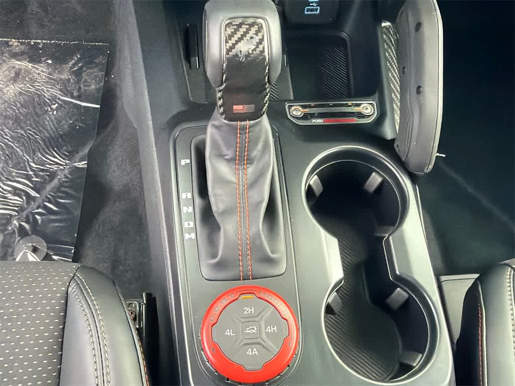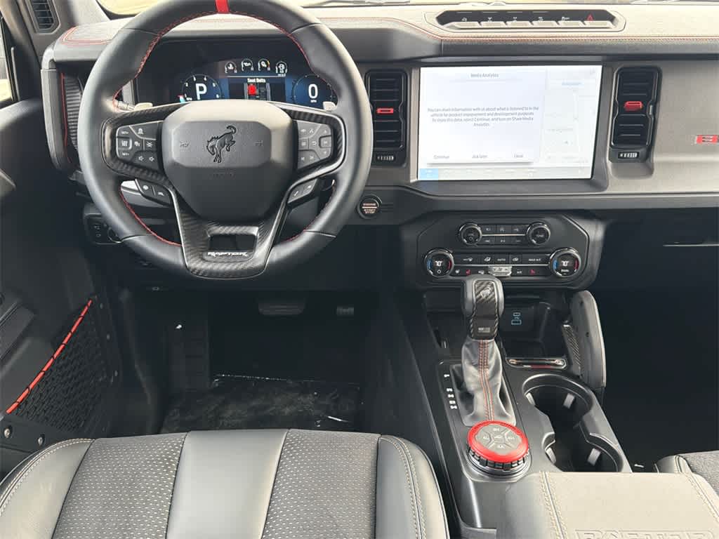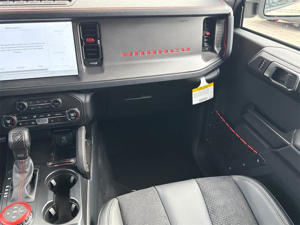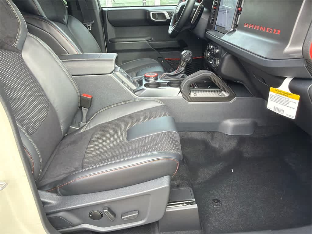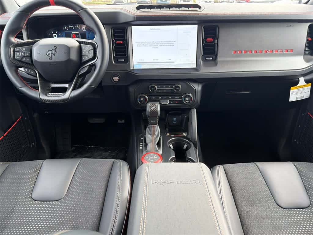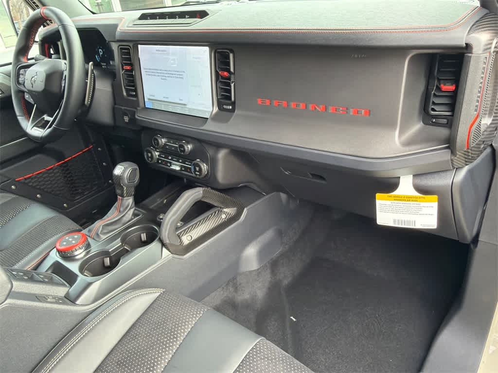 Bronco Raptor is nicely equipped with 12 Speakers, 4-Wheel Disc Brakes, ABS brakes, Air Conditioning, Alloy wheels, AM/FM radio: SiriusXM with 360L, Auto High-beam Headlights, Auto-dimming Rear-View mirror, Automatic temperature control, Brake assist, Compass, Connected Navigation, Convertible HardTop, Convertible roof lining, Delay-off headlights, Driver door bin, Driver vanity mirror, Dual front impact airbags, Dual front side impact airbags, Electronic Stability Control, Emergency communication system: 911 Assist, Exterior Parking Camera Rear, Front anti-roll bar, Front Bucket Seats, Front Center Armrest, Front dual zone A/C, Front fog lights, Front reading lights, Front wheel independent suspension, Fully automatic headlights, Garage door transmitter, Glass rear window, Heated door mirrors, Heated front seats, Heated steering wheel, Illuminated entry, Integrated roll-over protection, Leather Shift Knob, Low tire pressure warning, Marine Grade Vinyl Bucket Seats, Navigation system: Connected Navigation, Occupant sensing airbag, Outside temperature display, Overhead airbag, Overhead console, Panic alarm, Passenger door bin, Passenger vanity mirror, Power door mirrors, Power steering, Power windows, Radio data system, Radio: B&O Sound System by Bang & Olufsen, Rear anti-roll bar, Rear seat center armrest, Rear window defroster, Rear window wiper, Remote keyless entry, Security system, SiriusXM w/360L, Speed control, Split folding rear seat, Steering wheel mounted audio controls, SYNC 4, Tachometer, Telescoping steering wheel, Tilt steering wheel, Traction control, Trip computer, Turn signal indicator mirrors, Variably intermittent wipers, Voltmeter, and Wheels: 17 Black High Gloss-Painted Aluminum.