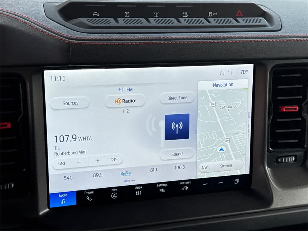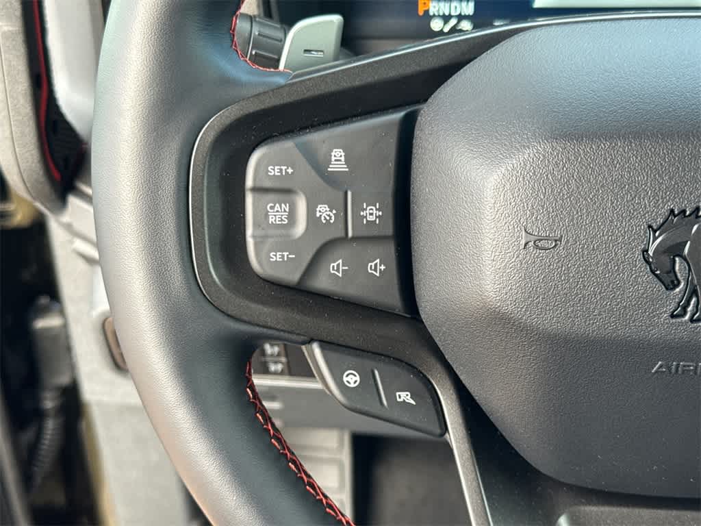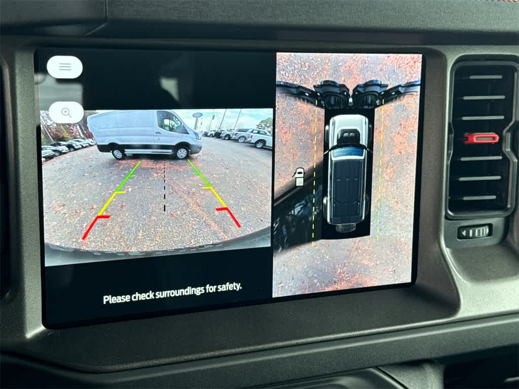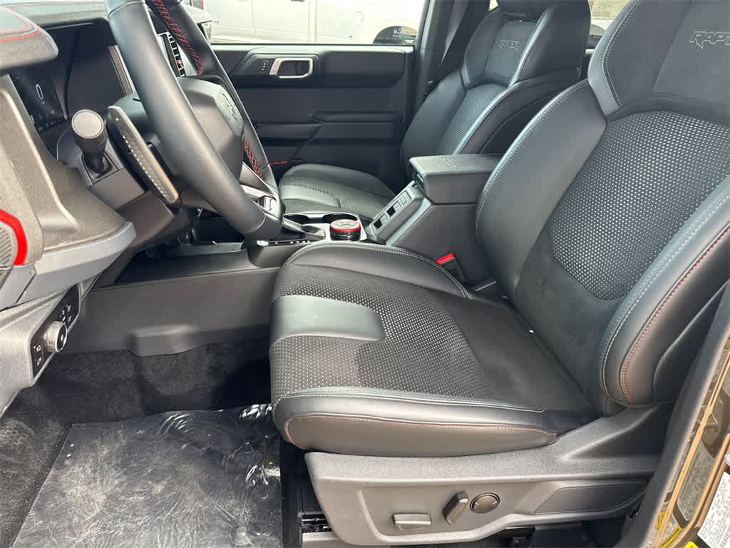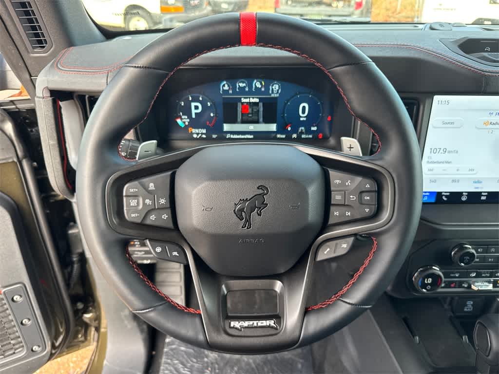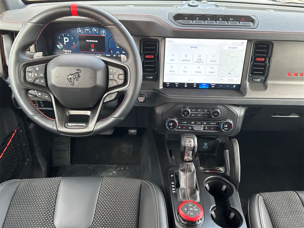 Bronco Raptor is nicely equipped with Equipment Group 374A Lux Package, 12 Speakers, 4-Wheel Disc Brakes, ABS brakes, Air Conditioning, Alloy wheels, AM/FM radio: SiriusXM with 360L, Auto High-beam Headlights, Auto-dimming Rear-View mirror, Automatic temperature control, Brake assist, Compass, Connected Navigation, Convertible HardTop, Convertible roof lining, Delay-off headlights, Driver door bin, Driver vanity mirror, Dual front impact airbags, Dual front side impact airbags, Electronic Stability Control, Emergency communication system: 911 Assist, Exterior Parking Camera Rear, Front anti-roll bar, Front Bucket Seats, Front Center Armrest, Front dual zone A/C, Front fog lights, Front reading lights, Front wheel independent suspension, Fully automatic headlights, Garage door transmitter, Glass rear window, Hard Top Sound Deadening Headliner, Heated door mirrors, Heated front seats, Heated steering wheel, Illuminated entry, Integrated roll-over protection, Leather Shift Knob, Leather-Trimmed/Vinyl Bucket Seats, Low tire pressure warning, Marine Grade Vinyl Bucket Seats, Navigation system: Connected Navigation, Occupant sensing airbag, Outside temperature display, Overhead airbag, Overhead console, Panic alarm, Passenger door bin, Passenger vanity mirror, Power door mirrors, Power steering, Power windows, Radio data system, Radio: B&O Sound System by Bang & Olufsen, Rear anti-roll bar, Rear seat center armrest, Rear window defroster, Rear window wiper, Rear-Window Defroster & Washer, Remote keyless entry, Security system, Shadow Black Painted Hard Top, SiriusXM w/360L, Speed control, Split folding rear seat, Steering wheel mounted audio controls, SYNC 4, Tachometer, Telescoping steering wheel, Tilt steering wheel, Traction control, Trip computer, Turn signal indicator mirrors, Variably intermittent wipers, Voltmeter, and Wheels: 17 Black High Gloss-Painted Aluminum.