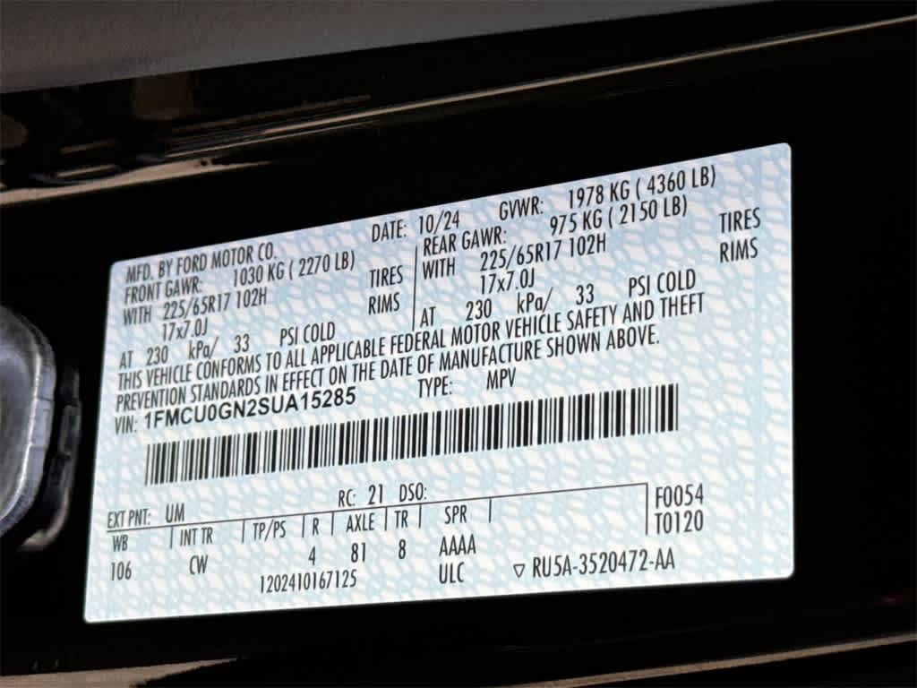 Escape Active is nicely equipped with Active Premium Tech Pack (10-Way Power Drivers Seat, 12.3 Productivity Screen in Instrument Cluster, 6-Way Power Passenger Seat, HD Radio, Power Liftgate, Radio: B&O Sound System by Bang & Olufsen, and Wireless Charging Pad), Cold Weather Package (Heated Front Row Seats, Heated Sideview Mirrors, Heated Steering Wheel, and Remote Starter System), Equipment Group 200A, Memory Package, Tech Pack #1 (Adaptive Cruise Control w/Stop-and-Go, Connected Navigation, Ford Co-Pilot360 Assist+, Intersection Assist, Predictive Speed Assist, Rear Parking Sensor, Rear-View Camera, and SYNC 4 w/Enhanced Voice Recognition), 3.81 Axle Ratio, 4-Wheel Disc Brakes, 6 Speakers, ABS brakes, Air Conditioning, Alloy wheels, AM/FM radio: SiriusXM, AM/FM Stereo, Auto High-beam Headlights, Automatic temperature control, Black Roof-Rack Side Rails, Brake assist, Bumpers: body-color, Compass, Delay-off headlights, Driver door bin, Driver vanity mirror, Dual front impact airbags, Dual front side impact airbags, Electronic Stability Control, Emergency communication system: SYNC 4 911 Assist, FordPass Connect, Four wheel independent suspension, Front anti-roll bar, Front Bucket Seats, Front Center Armrest, Front dual zone A/C, Front reading lights, Fully automatic headlights, Illuminated entry, Knee airbag, Low tire pressure warning, Occupant sensing airbag, Outside temperature display, Overhead airbag, Overhead console, Panic alarm, Panoramic Vista Roof, Passenger door bin, Passenger vanity mirror, Power door mirrors, Power steering, Power windows, Radio data system, Rear anti-roll bar, Rear reading lights, Rear seat center armrest, Rear window defroster, Rear window wiper, Remote keyless entry, Speed control, Speed-sensing steering, Speed-Sensitive Wipers, Split folding rear seat, Spoiler, Steering wheel mounted audio controls, SYNC 4, Tachometer, Telescoping steering wheel, Tilt steering wheel, Traction control, Trip computer, Unique Cloth Front Bucket Seats, Variably intermittent wipers, and Wheels: 17 Shadow Silver-Painted Aluminum. Price includes: $5000 - Model Year Closeout Bonus Cash - Escape Gas/Hybrid. Exp. 03/31/2026