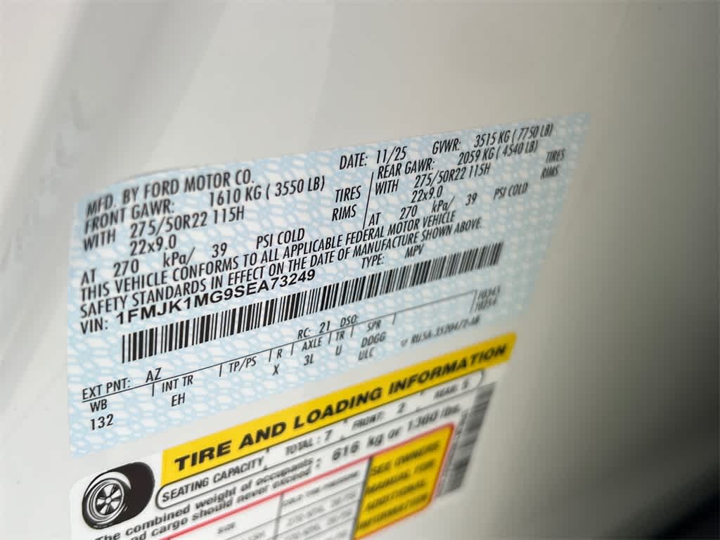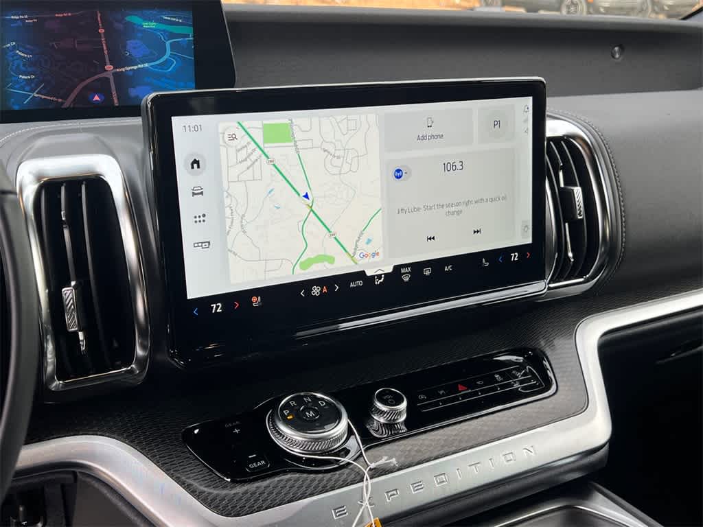 Expedition Max Platinum is nicely equipped with Connectivity Package (One-Time Purchase), Drivers Package (Continuous Control Damping Suspension, Radio: B&O Unleashed Sound System by Bang & Olufsen, and SiriusXM w/360L), Equipment Group 600A Standard Package (2nd Row Power-Folding Captains Chairs), Stealth Appearance Package (Black Belt Molding, Black Expedition Lettering On Hood, Black Headlamp Bezel w/Ebony Trim Applique, Black Platinum Badge On Tailgate, Black Roof Rails, Carbon Black Front Bumper/Fascia, Engine Sound Enhancer, Rear Side Windows Laminated Glass, and Signature Grille Lighting), Stealth Performance Package (High Flow Exhaust System, Red Brake Calipers, and Wheels: 22 Magnetite Painted Aluminum), 10 Speakers, 3.73 Axle Ratio, 3rd row seats: split-bench, 4-Wheel Disc Brakes, ABS brakes, Adjustable pedals, Air Conditioning, Alloy wheels, AM/FM radio: SiriusXM with 360L, Apple CarPlay/Android Auto, Auto High-beam Headlights, Auto-dimming door mirrors, Auto-dimming Rear-View mirror, Automatic temperature control, BlueCruise Equipped (1-Year Plan), Brake assist, Bumpers: body-color, Compass, Delay-off headlights, Driver door bin, Driver vanity mirror, Dual front impact airbags, Dual front side impact airbags, Electronic Stability Control, Emergency communication system: 911 Assist, Exterior Parking Camera Rear, Four wheel independent suspension, Front anti-roll bar, Front Bucket Seats, Front Center Armrest, Front dual zone A/C, Front reading lights, Fully automatic headlights, Garage door transmitter, Genuine wood dashboard insert, Genuine wood door panel insert, Heated & Ventilated Leather Front Captains Chairs, Heated door mirrors, Heated front seats, Heated rear seats, Heated steering wheel, Illuminated entry, Leather steering wheel, Low tire pressure warning, Memory seat, Navigation System, Occupant sensing airbag, Outside temperature display, Overhead airbag, Overhead console, Panic alarm, Passenger door bin, Passenger vanity mirror, Pedal memory, Power door mirrors, Power driver seat, Power moonroof: Vista Roof, Power passenger seat, Power steering, Power windows, Radio data system, Radio: B&O Sound System by Bang & Olufsen, Rain sensing wipers, Rear air conditioning, Rear anti-roll bar, Rear reading lights, Rear window defroster, Rear window wiper, Reclining 3rd row seat, Remote keyless entry, Security system, Speed control, Speed-sensing steering, Speed-Sensitive Wipers, Split folding rear seat, Spoiler, Steering wheel memory, Steering wheel mounted audio controls, Tachometer, Telescoping steering wheel, Tilt steering wheel, Traction control, Trip computer, Turn signal indicator mirrors, Variably intermittent wipers, Ventilated front seats, Voltmeter, and Wheels: 20 Ebony Bright Machined Aluminum.