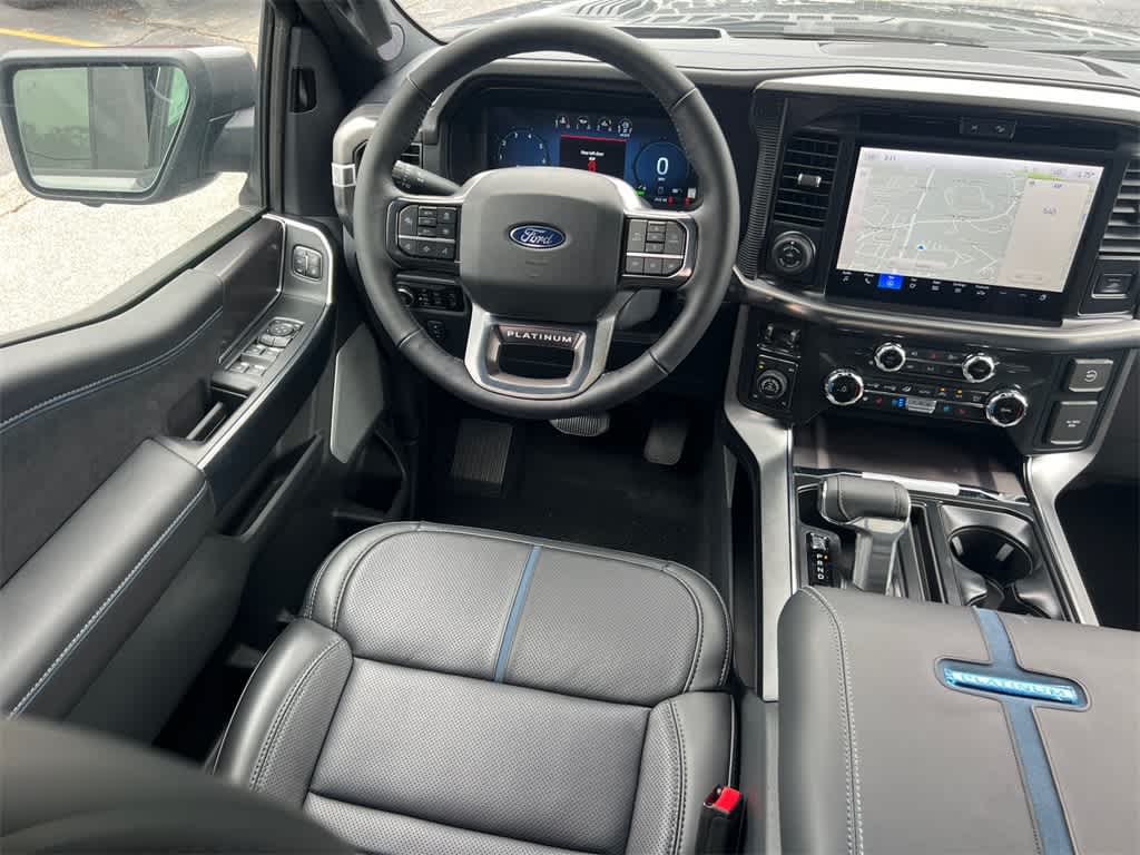 F-150 Platinum is nicely equipped with Equipment Group 702A High (Heads-Up Display, Radio: B&O Unleashed Sound System by Bang & Olufsen, and Twin Panel Moonroof), FX4 Off-Road Package (4x4 FX4 Off-Road Bodyside Decal, Hill Descent Control, Monotube Rear Shocks, Off-Road Tuned Front Shock Absorbers, and Rock Crawl Mode), 3.5L PowerBoost Full-Hybrid V6, 4WD, 4-Wheel Disc Brakes, 8 Speakers, ABS brakes, Adjustable pedals, Air Conditioning, Alloy wheels, Auto High-beam Headlights, Auto tilt-away steering wheel, Auto-dimming door mirrors, Auto-dimming Rear-View mirror, Automatic temperature control, Brake assist, Bumpers: body-color, Compass, Delay-off headlights, Driver door bin, Driver vanity mirror, Dual front impact airbags, Dual front side impact airbags, Electronic Locking w/3.55 Axle Ratio, Electronic Stability Control, Emergency communication system: SYNC 4 911 Assist, Front anti-roll bar, Front Bucket Seats, Front Center Armrest, Front dual zone A/C, Front fog lights, Front License Plate Bracket, Front reading lights, Front wheel independent suspension, Fully automatic headlights, Garage door transmitter, Heated door mirrors, Heated front seats, Heated rear seats, Heated steering wheel, Illuminated entry, Leather steering wheel, Low tire pressure warning, Max Tow Electronic Locking w/3.73 Axle Ratio, Memory seat, Navigation system: Connected Navigation, Occupant sensing airbag, Outside temperature display, Overhead airbag, Overhead console, Panic alarm, Passenger door bin, Passenger vanity mirror, Pedal memory, Power door mirrors, Power driver seat, Power passenger seat, Power steering, Power windows, Radio data system, Radio: B&O Sound System by Bang & Olufsen, Rain sensing wipers, Rear reading lights, Rear seat center armrest, Rear step bumper, Rear window defroster, Remote keyless entry, Retractable Rear Center Step, Security system, Speed control, Split folding rear seat, Steering wheel memory, Steering wheel mounted audio controls, SYNC 4 w/Enhanced Voice Recognition, Tachometer, Telescoping steering wheel, Tilt steering wheel, Tough Bed Spray-In Bedliner, Traction control, Tray Style Floor Liner, Trip computer, Turn signal indicator mirrors, Unique Multi-Contour Leather Bucket Seats, Variably intermittent wipers, Ventilated front seats, Voltmeter, Wheel Well Liner, and Wheels: 20 Painted Gloss Ebony Black. Price includes: $2000 - Retail Customer Cash. Exp. 03/31/2026
