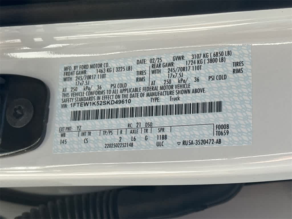 F-150 XL is nicely equipped with Equipment Group 101A Standard, GVWR: 6,426 lbs Payload Package, GVWR: 7,100 lbs Payload Package, Tow/Haul Package (Integrated Trailer Brake Controller), 4-Wheel Disc Brakes, 6 Speakers, ABS brakes, Air Conditioning, AM/FM radio: SiriusXM with 360L, Auto High-beam Headlights, Black Platform Running Boards, Brake assist, Cloth 40/20/40 Front Seat, Compass, Delay-off headlights, Driver door bin, Dual front impact airbags, Dual front side impact airbags, Electronic Stability Control, Emergency communication system: SYNC 4 911 Assist, Front anti-roll bar, Front Center Armrest, Front License Plate Bracket, Front reading lights, Front wheel independent suspension, Fully automatic headlights, Heated door mirrors, Illuminated entry, Low tire pressure warning, Occupant sensing airbag, Outside temperature display, Overhead airbag, Overhead console, Panic alarm, Passenger door bin, Passenger vanity mirror, Power door mirrors, Power steering, Power windows, Radio data system, Radio: AM/FM Stereo w/SiriusXM 360L, Rear Parking Sensors, Rear step bumper, Remote keyless entry, Security system, Speed control, Split folding rear seat, Steering wheel mounted audio controls, SYNC 4 w/Enhanced Voice Recognition, Tachometer, Telescoping steering wheel, Tilt steering wheel, Tough Bed Spray-In Bedliner, Traction control, Trip computer, Variably intermittent wipers, Voltmeter, and Wheels: 17 Silver Steel. Price includes: $2000 - Retail Customer Cash. Exp. 03/31/2026