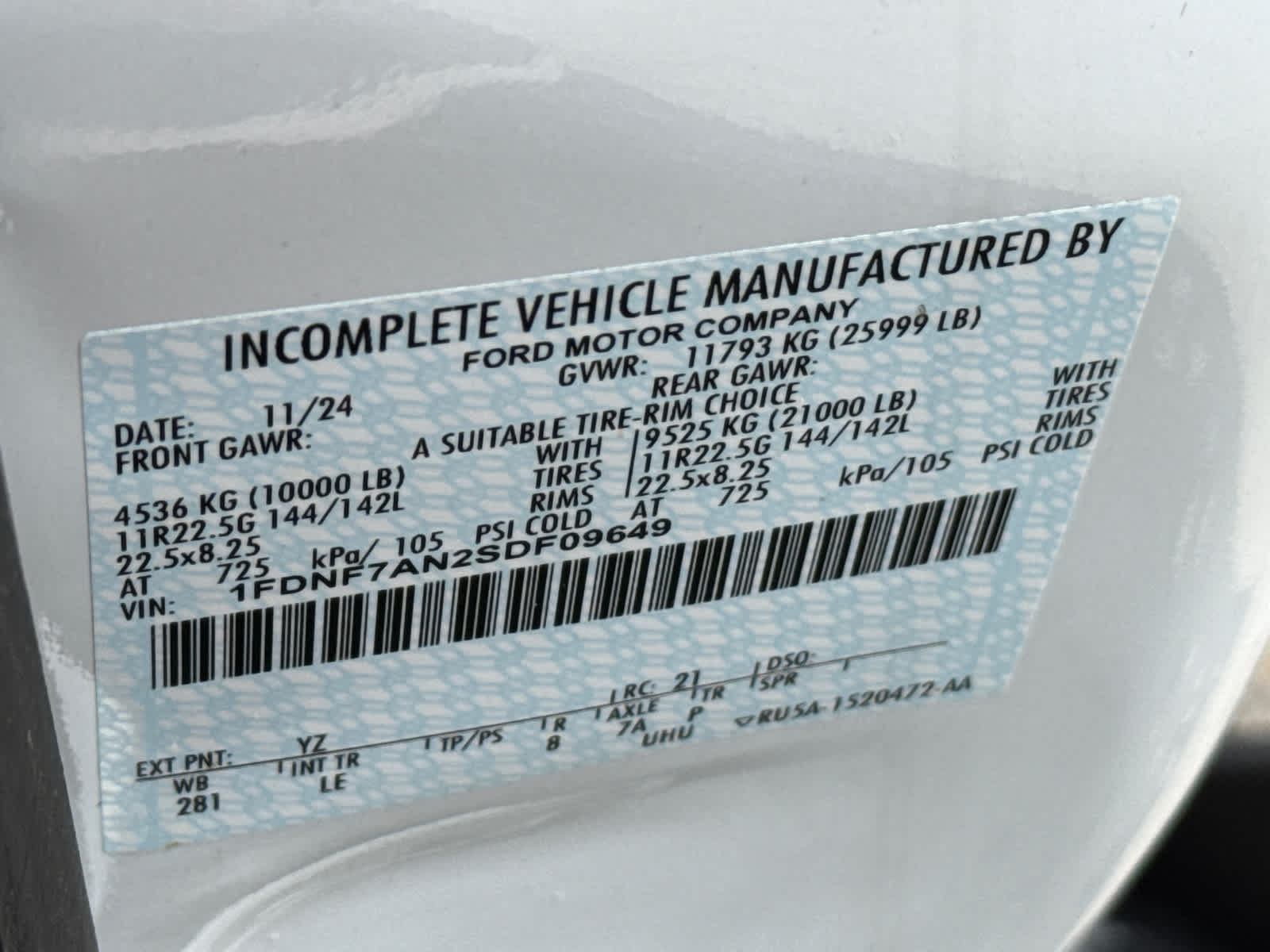 F-750SD Base is nicely equipped with Driver Assist Technology Package. Hydraulic Brake, Preferred Equipment Package 600A (Body Builder Wiring - At Back of Cab, Combined, Intelligent Oil Life Monitor, Lights - Roof Marker/Clearance - Amber Lenses, 5 Lights, and Steering Column - Tilt / Telescoping), 110 A/C Outlet - in Lower Center Finish Panel, 2 Speakers, 7.17 Axle Ratio, ABS brakes, Air Conditioning, AM/FM radio, Delay-off headlights, Drivers Seat Mounted Armrest, Dual rear wheels, Electronic Stability Control, Four Body Builder Switches - Mounted in Center Instrument Panel, Front reading lights, Front Stabilizer Bar, Fully automatic headlights, Heated door mirrors, Jump Start Stud - Remote Mounted, Passenger seat mounted armrest, Passenger vanity mirror, Power steering, SecuriLock Passive Anti-Theft System, Shock Absorbers, Rear - Double Acting, Speed control, Speed-Sensitive Wipers, Steering wheel mounted audio controls, Tachometer, Telescoping steering wheel, Tilt steering wheel, Traction control, Trip computer, and Variably intermittent wipers. Price includes dealer added accessories.