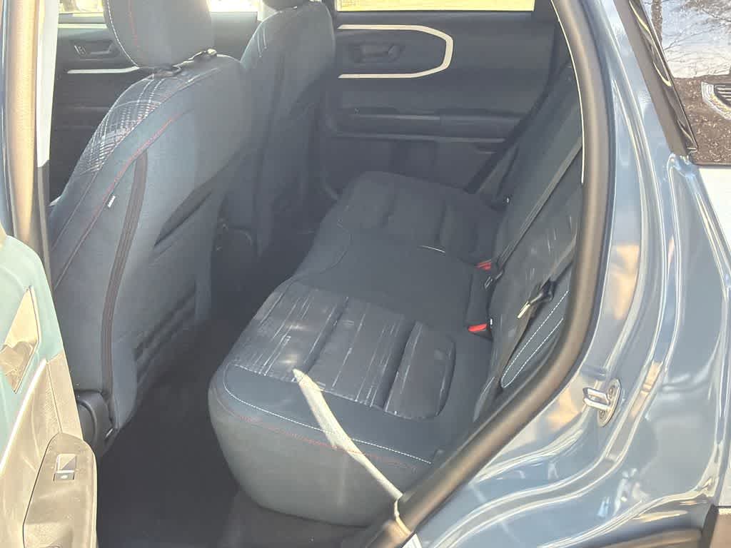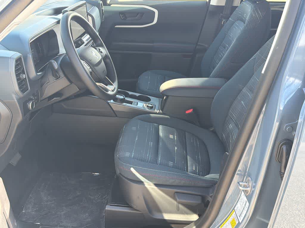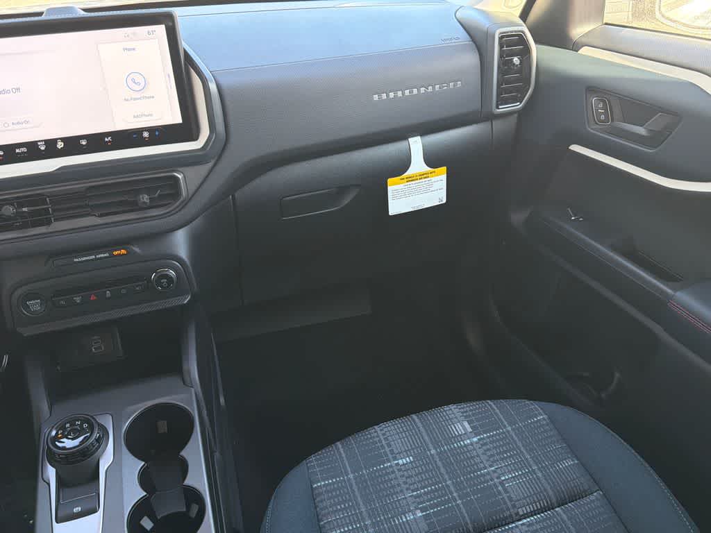 Bronco Sport Heritage is nicely equipped with Equipment Group 250A Standard Package (AM/FM Stereo, Front Driver/Passenger Seat Back Map Pockets, Plaid Cloth Front Bucket Seats, SiriusXM with 360L, SYNC 4 with Enhanced Voice Recognition, and Wheels: 17 Oxford White-Painted Aluminum), Ford Connectivity Package (1-Year Included), Internet access capable: 5G Modem - Ford Connectivity Package, 4-Wheel Disc Brakes, 6 Speakers, ABS brakes, Air Conditioning, Alloy wheels, AM/FM radio: SiriusXM with 360L, Apple CarPlay/Android Auto, Auto High-beam Headlights, Automatic temperature control, Brake assist, Compass, Delay-off headlights, Driver door bin, Driver vanity mirror, Dual front impact airbags, Dual front side impact airbags, Electronic Stability Control, Emergency communication system: SYNC 4 911 Assist, Exterior Parking Camera Rear, Four wheel independent suspension, Front anti-roll bar, Front Bucket Seats, Front Center Armrest, Front reading lights, Fully automatic headlights, Heated door mirrors, Illuminated entry, Knee airbag, Low tire pressure warning, Occupant sensing airbag, Outside temperature display, Overhead airbag, Overhead console, Panic alarm, Passenger door bin, Passenger vanity mirror, Power door mirrors, Power steering, Power windows, Radio data system, Rear anti-roll bar, Rear Parking Sensors, Rear reading lights, Rear seat center armrest, Rear window defroster, Rear window wiper, Remote keyless entry, Security system, Speed control, Speed-sensing steering, Speed-Sensitive Wipers, Split folding rear seat, Steering wheel mounted audio controls, Tachometer, Telescoping steering wheel, Tilt steering wheel, Traction control, Trip computer, and Variably intermittent wipers.