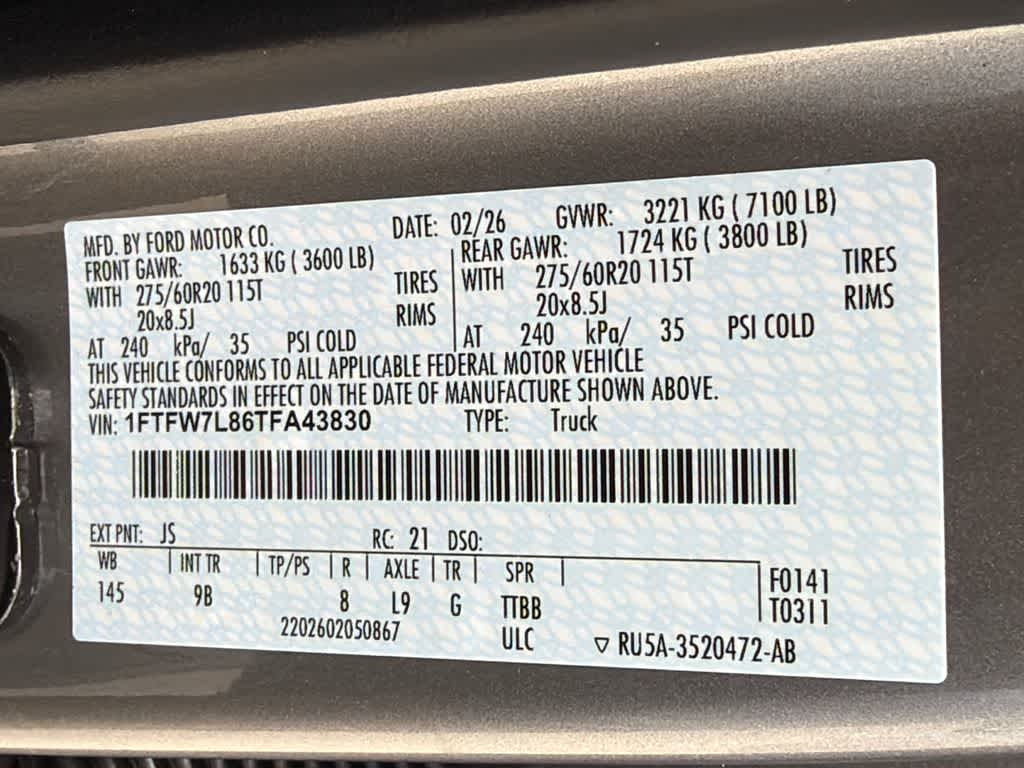 F-150 Platinum is nicely equipped with Equipment Group 702A High (Center High Mounted Stop Lamp (CHMSL) Camera, Electronic Locking with 3.55 Axle Ratio, Power-Deployable Running Boards, Radio: B&O Unleashed Sound System by Bang & Olufsen, Unique Multi-Contour Leather Bucket Seats, and Wheels: 20 Painted Gloss Ebony Black), Ford Connectivity Package (1-Year Included), GVWR: 7,400 lbs Payload Package, Internet access capable: 5G Modem - Ford Connectivity Package, 4WD, 4-Wheel Disc Brakes, 8 Speakers, ABS brakes, Adjustable pedals, Air Conditioning, Alloy wheels, AM/FM radio: SiriusXM with 360L, Auto High-beam Headlights, Auto tilt-away steering wheel, Auto-dimming door mirrors, Auto-dimming Rear-View mirror, Automatic temperature control, Brake assist, Bumpers: body-color, Compass, Delay-off headlights, Driver door bin, Driver vanity mirror, Drivers Side SecuriCode Keyless-Entry Keypad, Dual front impact airbags, Dual front side impact airbags, Electronic Stability Control, Emergency communication system: SYNC 4 911 Assist, Front anti-roll bar, Front Bucket Seats, Front Center Armrest, Front dual zone A/C, Front fog lights, Front reading lights, Front wheel independent suspension, Fully automatic headlights, Garage door transmitter, Heated door mirrors, Heated front seats, Heated rear seats, Heated steering wheel, Illuminated entry, Leather steering wheel, Low tire pressure warning, Memory seat, Navigation system: Connected Navigation, Occupant sensing airbag, Outside temperature display, Overhead airbag, Overhead console, Panic alarm, Passenger door bin, Passenger vanity mirror, Pedal memory, Power door mirrors, Power driver seat, Power passenger seat, Power steering, Power windows, Radio data system, Radio: B&O Sound System by Bang and Olufsen, Rain sensing wipers, Rear reading lights, Rear seat center armrest, Rear step bumper, Rear window defroster, Remote keyless entry, Security system, Speed control, Split folding rear seat, Steering wheel memory, Steering wheel mounted audio controls, SYNC 4 with Enhanced Voice Recognition, Tachometer, Telescoping steering wheel, Tilt steering wheel, Tough Bed Spray-in Bedliner, Traction control, Trip computer, Turn signal indicator mirrors, Variably intermittent wipers, and Ventilated front seats.