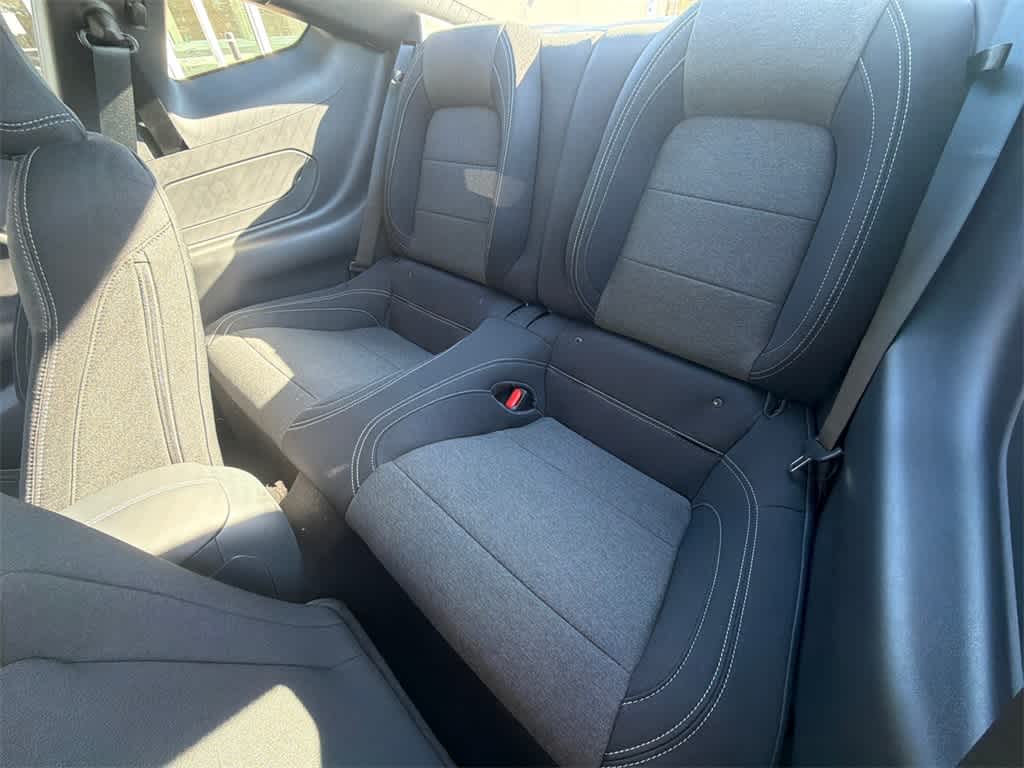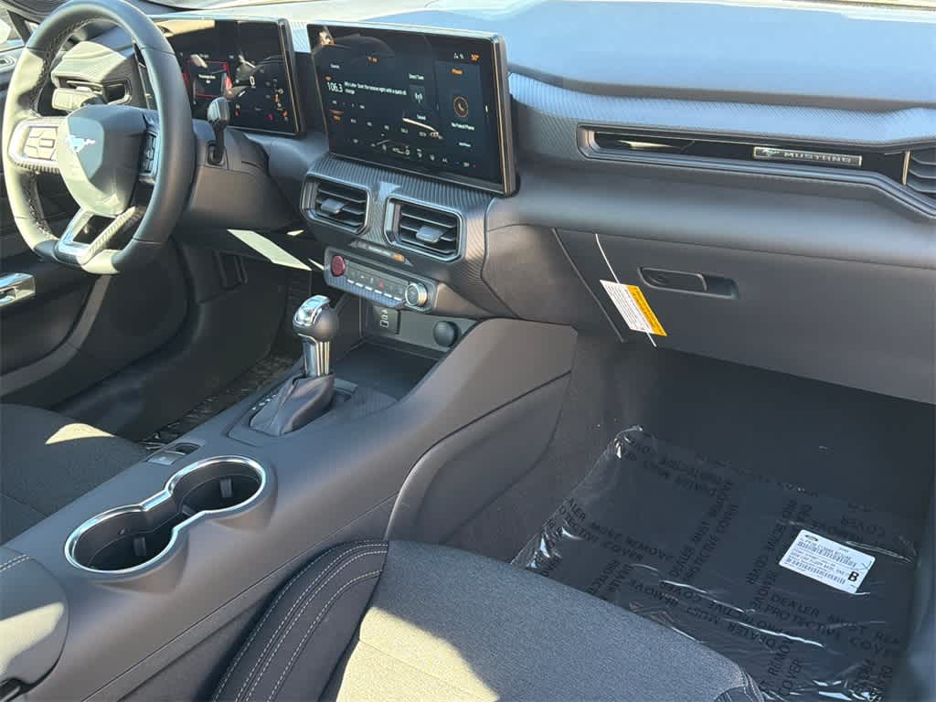 Mustang EcoBoost is nicely equipped with 1st Row Carpeted Black Floor Mats, 4-Wheel Disc Brakes, ABS brakes, Air Conditioning, Alloy wheels, AM/FM Stereo, Auto High-beam Headlights, Automatic temperature control, Brake assist, Bumpers: body-color, Compass, Delay-off headlights, Driver door bin, Driver vanity mirror, Dual front impact airbags, Dual front side impact airbags, Electronic Stability Control, Emergency communication system: 911 Assist, Exterior Parking Camera Rear, Four wheel independent suspension, Front anti-roll bar, Front Bucket Seats, Front Center Armrest, Front dual zone A/C, Front reading lights, Fully automatic headlights, Illuminated entry, Knee airbag, Leather Shift Knob, Low tire pressure warning, Occupant sensing airbag, Outside temperature display, Overhead airbag, Overhead console, Panic alarm, Passenger door bin, Passenger vanity mirror, Power door mirrors, Power steering, Power windows, Radio data system, Rain sensing wipers, Rear anti-roll bar, Rear Parking Sensors, Rear window defroster, Remote keyless entry, Speed control, Speed-sensing steering, Speed-Sensitive Wipers, Split folding rear seat, Sport steering wheel, Steering wheel mounted audio controls, SYNC 4, Tachometer, Telescoping steering wheel, Tilt steering wheel, Traction control, Trip computer, Variably intermittent wipers, and Voltmeter.