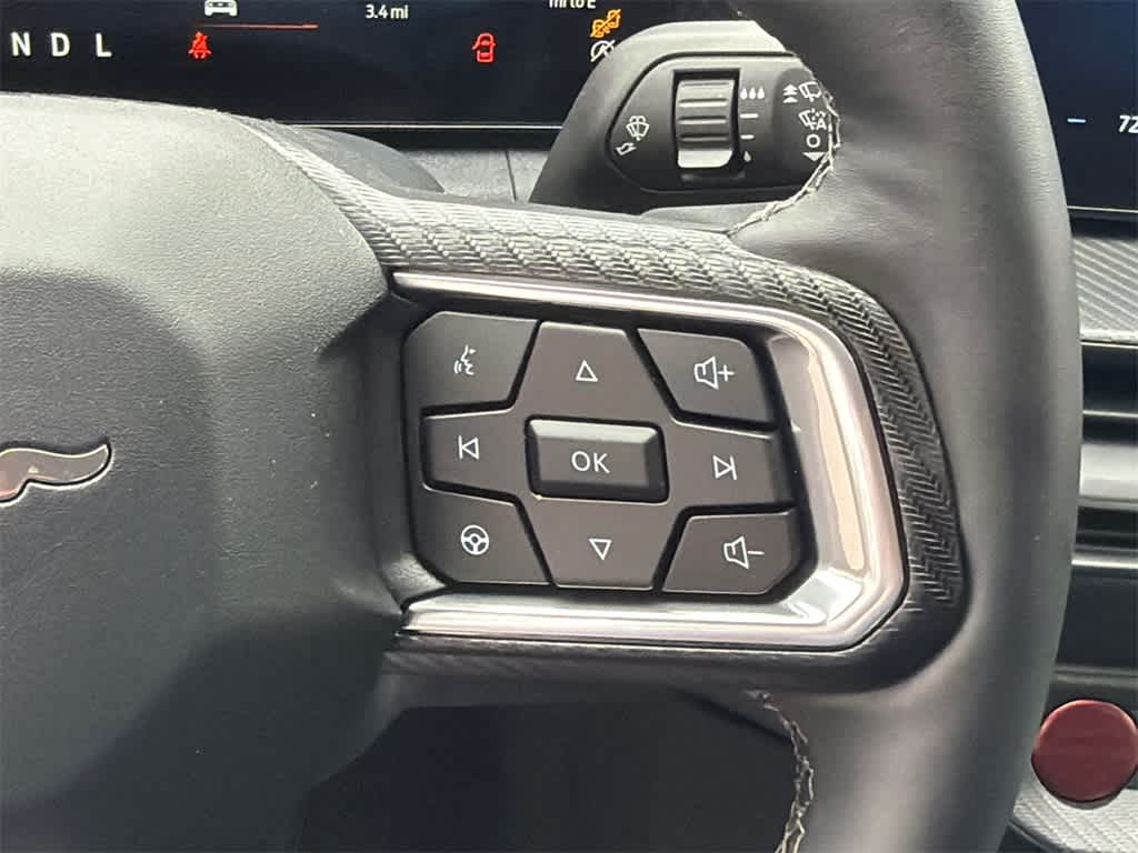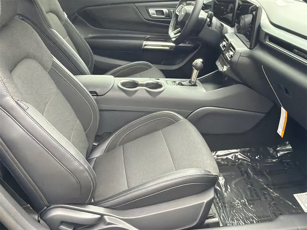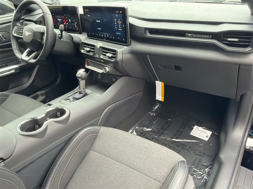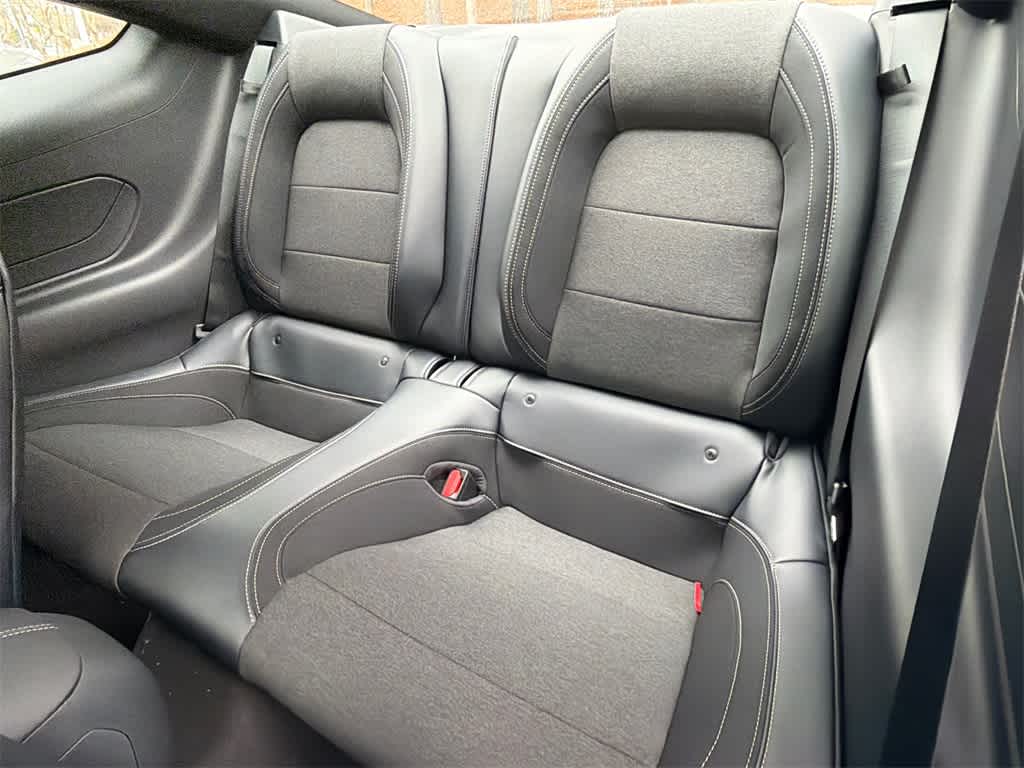 Mustang EcoBoost is nicely equipped with 1st Row Carpeted Black Floor Mats, 4-Wheel Disc Brakes, ABS brakes, Air Conditioning, Alloy wheels, AM/FM Stereo, Auto High-beam Headlights, Automatic temperature control, Brake assist, Bumpers: body-color, Compass, Delay-off headlights, Driver door bin, Driver vanity mirror, Dual front impact airbags, Dual front side impact airbags, Electronic Stability Control, Emergency communication system: 911 Assist, Exterior Parking Camera Rear, Four wheel independent suspension, Front anti-roll bar, Front Bucket Seats, Front Center Armrest, Front dual zone A/C, Front reading lights, Fully automatic headlights, Illuminated entry, Knee airbag, Leather Shift Knob, Low tire pressure warning, Occupant sensing airbag, Outside temperature display, Overhead airbag, Overhead console, Panic alarm, Passenger door bin, Passenger vanity mirror, Power door mirrors, Power steering, Power windows, Radio data system, Rain sensing wipers, Rear anti-roll bar, Rear Parking Sensors, Rear window defroster, Remote keyless entry, Speed control, Speed-sensing steering, Speed-Sensitive Wipers, Split folding rear seat, Sport steering wheel, Steering wheel mounted audio controls, SYNC 4, Tachometer, Telescoping steering wheel, Tilt steering wheel, Traction control, Trip computer, Variably intermittent wipers, and Voltmeter.