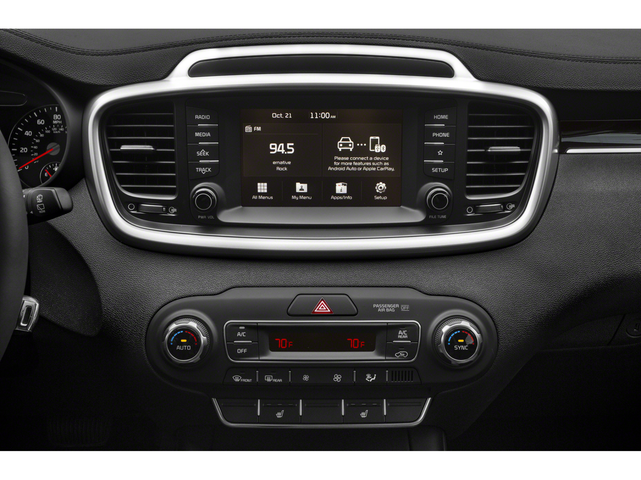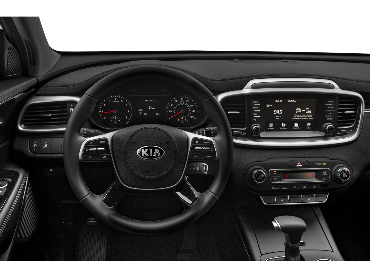 Sorento L is nicely equipped with 17 x 7.0 Alloy Wheels, 3.51 Axle Ratio, 3rd row seats: split-bench, 4-Wheel Disc Brakes, 6 Speakers, ABS brakes, Air Conditioning, Alloy wheels, AM/FM radio, Apple CarPlay & Android Auto, Brake assist, Bumpers: body-color, Cargo Net (Envelope), Carpeted Floor Mats (7-Passenger), Delay-off headlights, Driver door bin, Driver vanity mirror, Dual front impact airbags, Dual front side impact airbags, Electronic Stability Control, Exterior Parking Camera Rear, Four wheel independent suspension, Front anti-roll bar, Front Bucket Seats, Front Center Armrest, Front reading lights, Fully automatic headlights, Heated door mirrors, Illuminated entry, Low tire pressure warning, Occupant sensing airbag, Outside temperature display, Overhead airbag, Overhead console, Panic alarm, Passenger door bin, Passenger vanity mirror, Power door mirrors, Power steering, Power windows, Radio data system, Radio: AM/FM/MP3 Audio System, Rear anti-roll bar, Rear seat center armrest, Rear window defroster, Rear window wiper, Remote keyless entry, Security system, Speed control, Speed-sensing steering, Split folding rear seat, Spoiler, Steering wheel mounted audio controls, Tachometer, Telescoping steering wheel, Tilt steering wheel, Traction control, Trip computer, Turn signal indicator mirrors, Variably intermittent wipers, and YES Essentials Cloth Seat Trim.