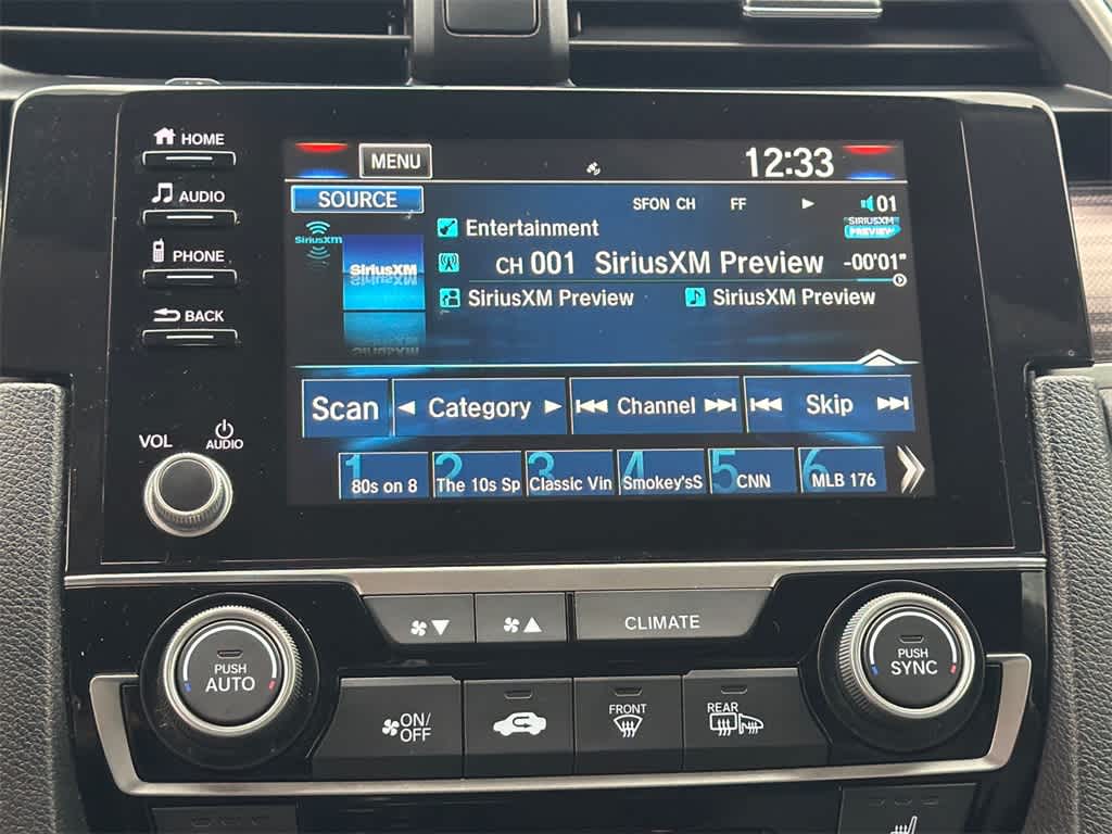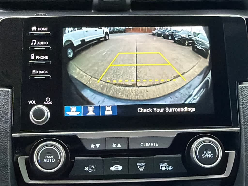 Civic EX-L is nicely equipped with Ford Blue Certified Non-Ford Certified, Black Leather, 17 Alloy Wheels, 4-Wheel Disc Brakes, 8 Speakers, ABS brakes, Adaptive Cruise Control: Adaptive Cruise Control (ACC) with Low-Speed Follow, Air Conditioning, Alloy wheels, AM/FM radio: SiriusXM, Apple CarPlay/Android Auto, Auto High-beam Headlights, Auto-dimming Rear-View mirror, Automatic temperature control, Brake assist, Bumpers: body-color, Delay-off headlights, Driver door bin, Driver vanity mirror, Dual front impact airbags, Dual front side impact airbags, Electronic Stability Control, Emergency communication system: HondaLink, Exterior Parking Camera Rear, Forward collision: Collision Mitigation Braking System (CMBS) + FCW mitigation, Four wheel independent suspension, Front anti-roll bar, Front Bucket Seats, Front Center Armrest, Front dual zone A/C, Front fog lights, Front reading lights, Fully automatic headlights, Garage door transmitter: HomeLink, Heated door mirrors, Heated Front Bucket Seats, Heated front seats, Illuminated entry, Lane departure: Lane Keeping Assist System (LKAS) active, Leather Seat Trim, Leather Shift Knob, Low tire pressure warning, Occupant sensing airbag, Outside temperature display, Overhead airbag, Overhead console, Panic alarm, Passenger door bin, Passenger vanity mirror, Power door mirrors, Power driver seat, Power moonroof, Power steering, Power windows, Radio data system, Radio: 180-Watt AM/FM/HD/SiriusXM Audio System, Rear anti-roll bar, Rear seat center armrest, Rear window defroster, Remote keyless entry, Security system, Speed control, Speed-sensing steering, Speed-Sensitive Wipers, Split folding rear seat, Spoiler, Steering wheel mounted audio controls, Tachometer, Telescoping steering wheel, Tilt steering wheel, Traction control, Trip computer, and Variably intermittent wipers.