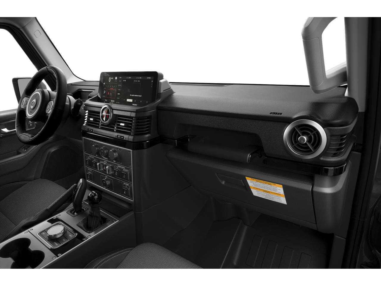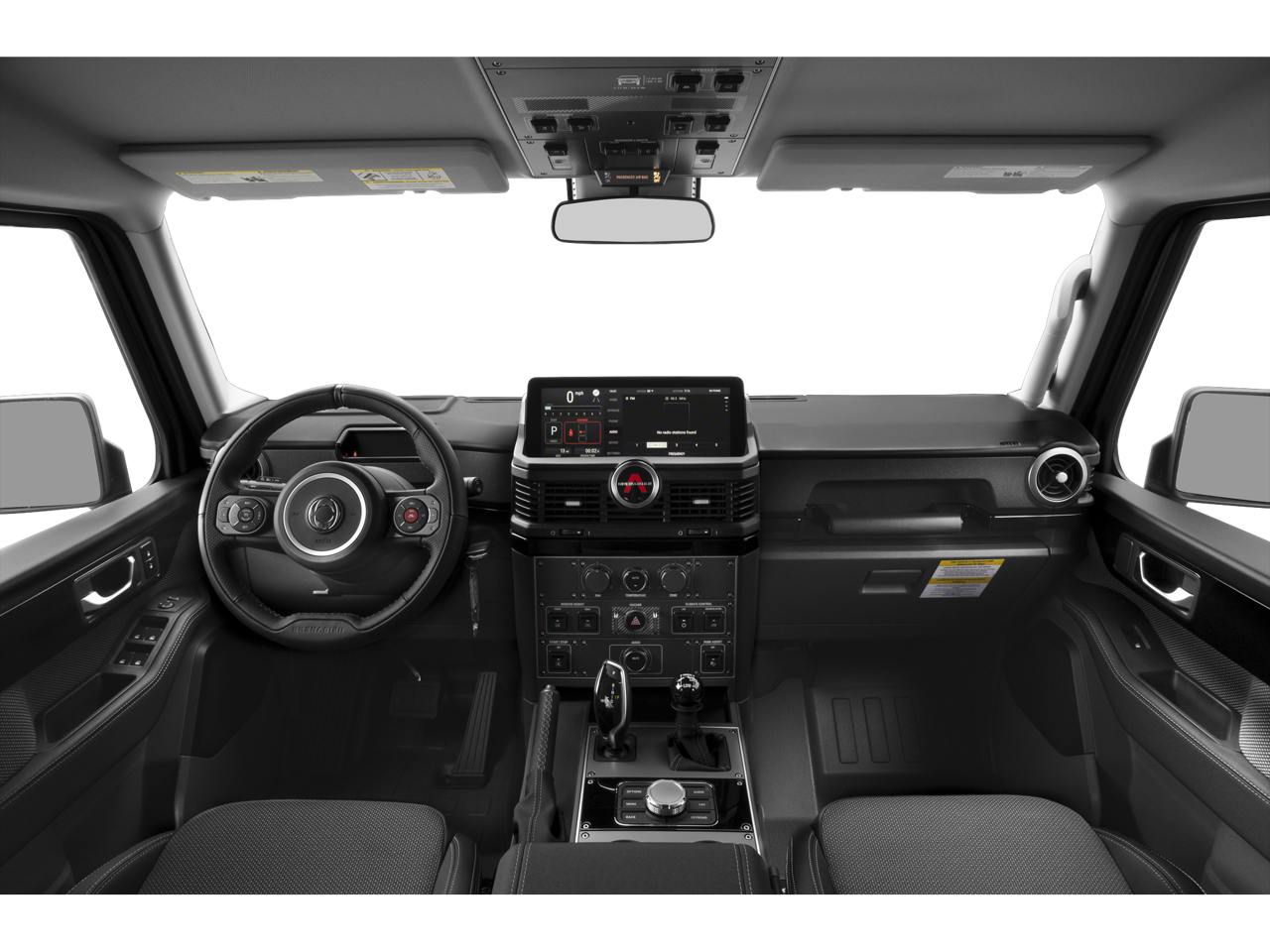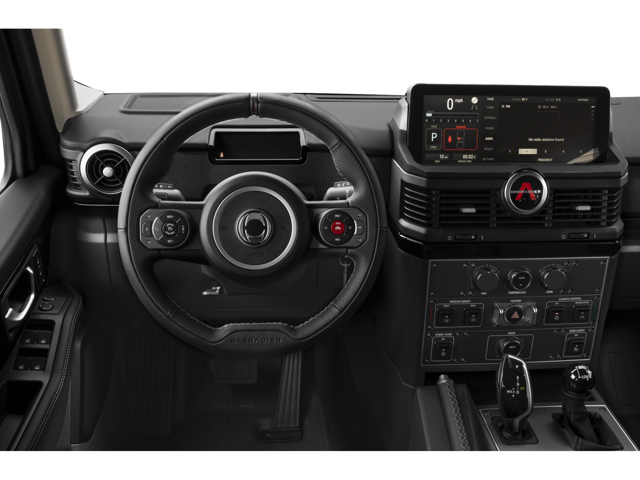 Grenadier Trialmaster Edition is nicely equipped with 18 Alloy Wheels, 4 Speakers, 4-Wheel Disc Brakes, ABS brakes, Air Conditioning, AM/FM radio, Anti-whiplash front head restraints, Auto High-beam Headlights, Automatic temperature control, Bodyside moldings, Bumpers: body-color, Driver door bin, Dual front impact airbags, Dual front side impact airbags, Electronic Stability Control, Exterior Parking Camera Rear, Front anti-roll bar, Front Bucket Seats, Front Center Armrest, Front reading lights, Heated door mirrors, Illuminated entry, Knee airbag, Leather Seat Trim, Leather steering wheel, Low tire pressure warning, Navigation System, Occupant sensing airbag, Outside temperature display, Overhead airbag, Overhead console, Panic alarm, Passenger door bin, Power door mirrors, Power steering, Power windows, Radio: Central Control System w/Navigation, Rear anti-roll bar, Rear fog lights, Rear window defroster, Rear window wiper, Remote keyless entry, Security system, Speed control, Speed-sensing steering, Split folding rear seat, Steering wheel mounted audio controls, Tachometer, TBD Axle Ratio, Telescoping steering wheel, Tilt steering wheel, Traction control, Trip computer, and Variably intermittent wipers.