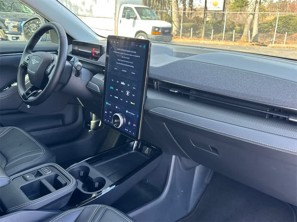 Mustang Mach-E Premium is nicely equipped with Equipment Group 300A Standard Package, Ford Blue Certified Certified, 10 Speakers, 4-Wheel Disc Brakes, ABS brakes, Air Conditioning, Alloy wheels, AM/FM radio: SiriusXM with 360L, Apple CarPlay/Android Auto, Auto High-beam Headlights, Auto-dimming Rear-View mirror, Automatic temperature control, Brake assist, Bumpers: body-color, Compass, Delay-off headlights, Driver door bin, Driver vanity mirror, Dual front impact airbags, Dual front side impact airbags, Electronic Stability Control, Emergency communication system: 911 Assist, Exterior Parking Camera Rear, Four wheel independent suspension, Front anti-roll bar, Front Bucket Seats, Front Center Armrest, Front dual zone A/C, Front reading lights, Fully automatic headlights, Garage door transmitter, Heated door mirrors, Heated front seats, Heated steering wheel, Heated/Ventilated Perforated ActiveX Bucket Seats, Illuminated entry, Internet access capable: FordPass Connect, Knee airbag, Low tire pressure warning, Memory seat, Navigation system: Connected Navigation, Occupant sensing airbag, Outside temperature display, Overhead airbag, Overhead console, Panic alarm, Passenger door bin, Passenger vanity mirror, Power door mirrors, Power driver seat, Power Liftgate, Power passenger seat, Power steering, Power windows, Radio data system, Radio: B&O Sound System by Bang & Olufsen, Rain sensing wipers, Rear anti-roll bar, Rear seat center armrest, Rear side impact airbag, Rear window defroster, Rear window wiper, Remote keyless entry, Security system, SiriusXM w/360L, Speed control, Speed-sensing steering, Speed-Sensitive Wipers, Split folding rear seat, Spoiler, Steering wheel mounted audio controls, SYNC 4A w/Enhanced Voice Recognition, Telescoping steering wheel, Tilt steering wheel, Traction control, Trip computer, Turn signal indicator mirrors, Variably intermittent wipers, Ventilated front seats, and Wheels: 19 Bright Machined-Face Aluminum.